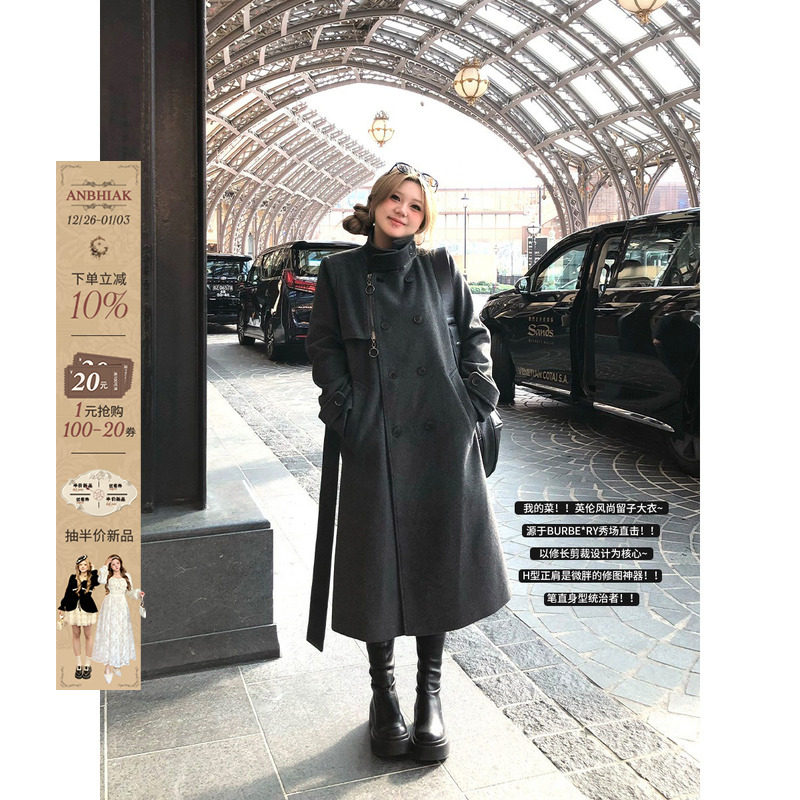 安妮不火 格雷系双排扣毛呢外套女2025秋冬新款微胖大码呢子大衣