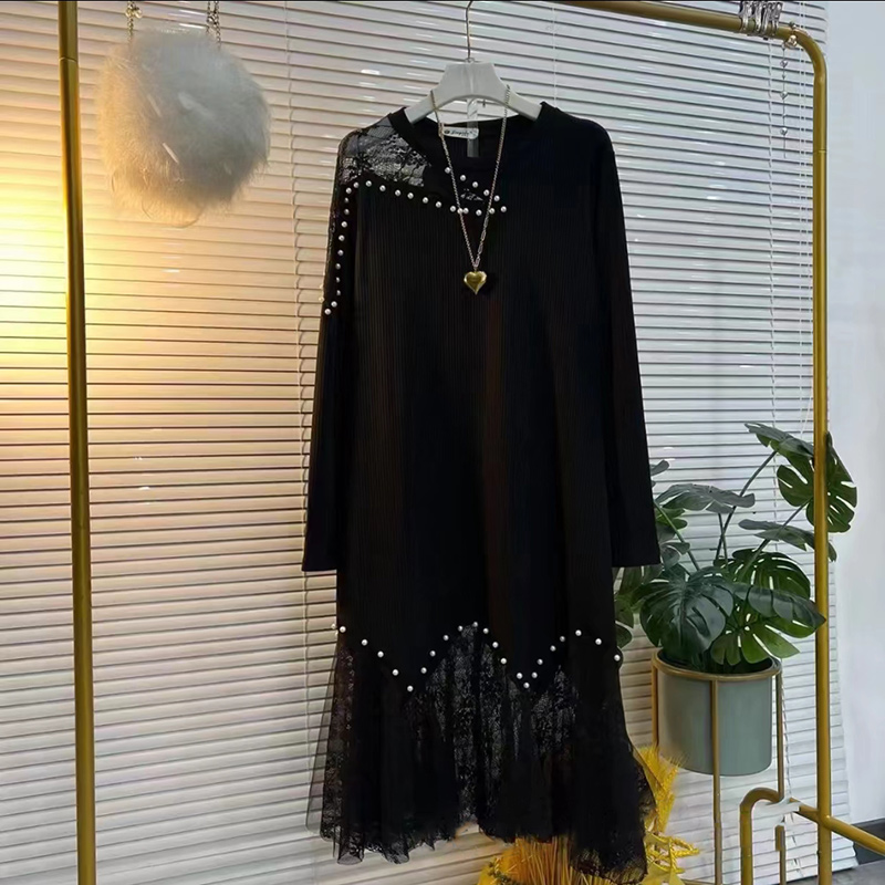 韩版胖MM大码女装秋冬气质打底连衣裙拼接鱼尾钉珠网纱大衫过膝裙
