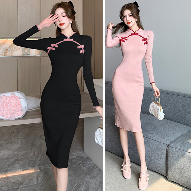 她来了复古馆酒红旗袍秋冬季新中式国民针织改良气质打底连衣裙子