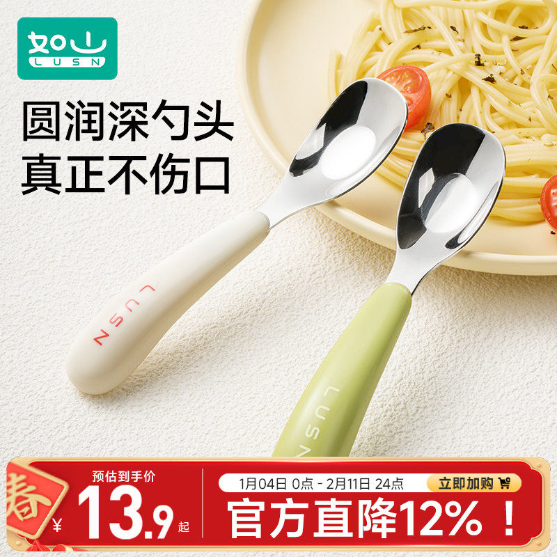 如山元宝勺子婴儿316L不锈钢儿童宝宝自主进食吃饭调羹长柄辅食勺