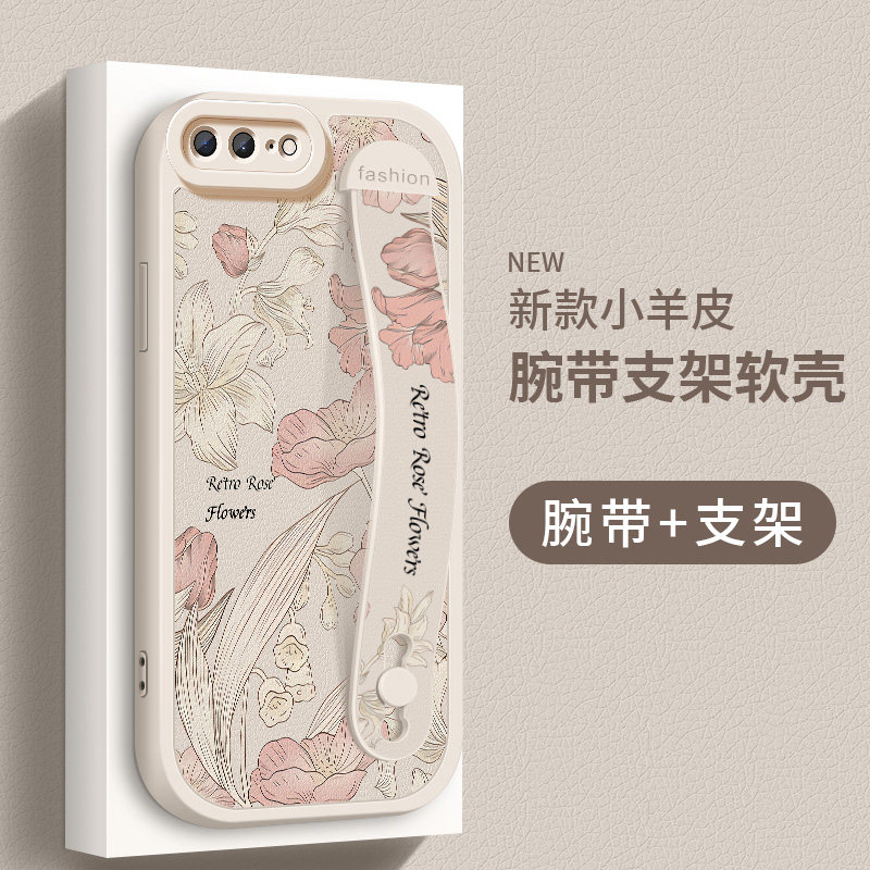 适用苹果7手机壳新款iphone7plus小羊皮ip复古花卉se2/3硅胶7p腕带支架软壳8plus高级防摔镜头保护套女款外壳