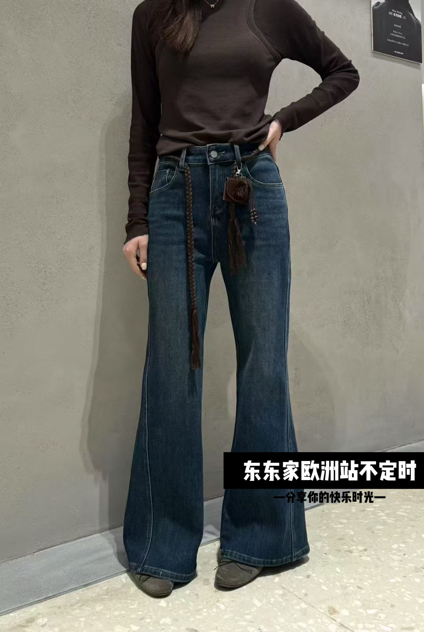 欧洲站2025年秋冬抓绒腰包流苏腰带微喇牛仔裤长裤不贴腿时髦显瘦
