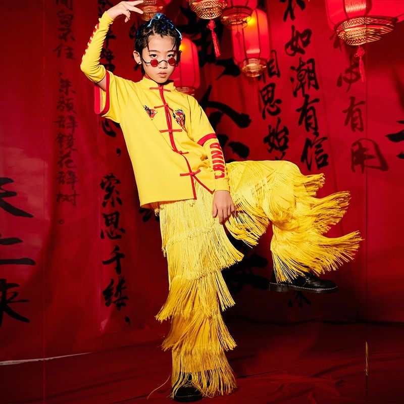 儿童街舞演出服嘻哈国潮学生表演服男童中国风啦啦队流苏长裤套装