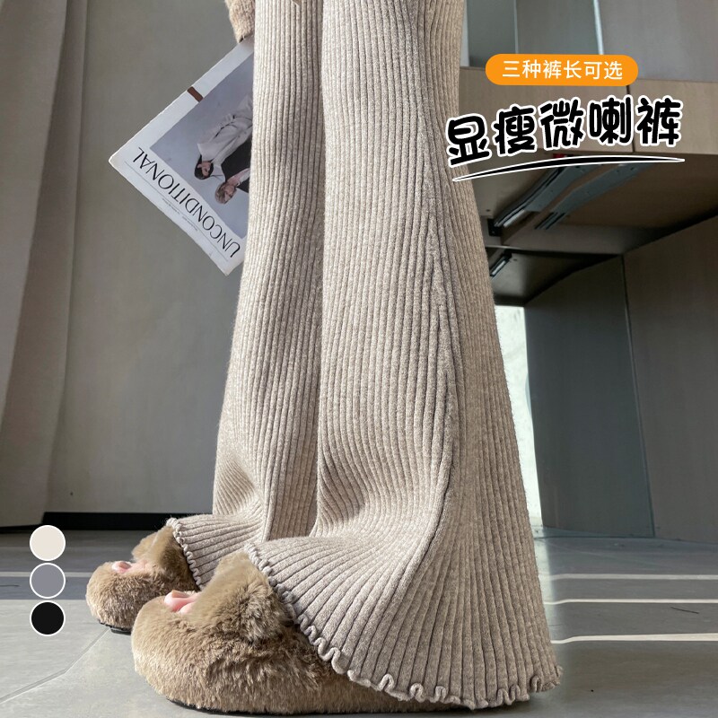 秋冬垂感流苏微喇叭针织阔腿裤女高腰加厚显瘦白色休闲拖地长裤子