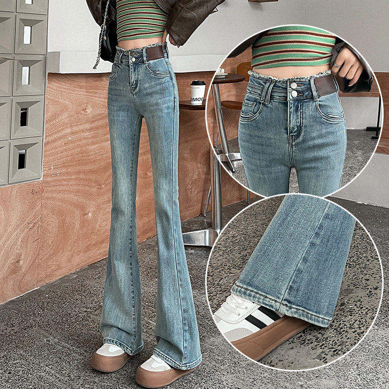 李李服饰加绒流苏毛边微喇叭牛仔裤女25冬款修身高腰提臀气质长裤