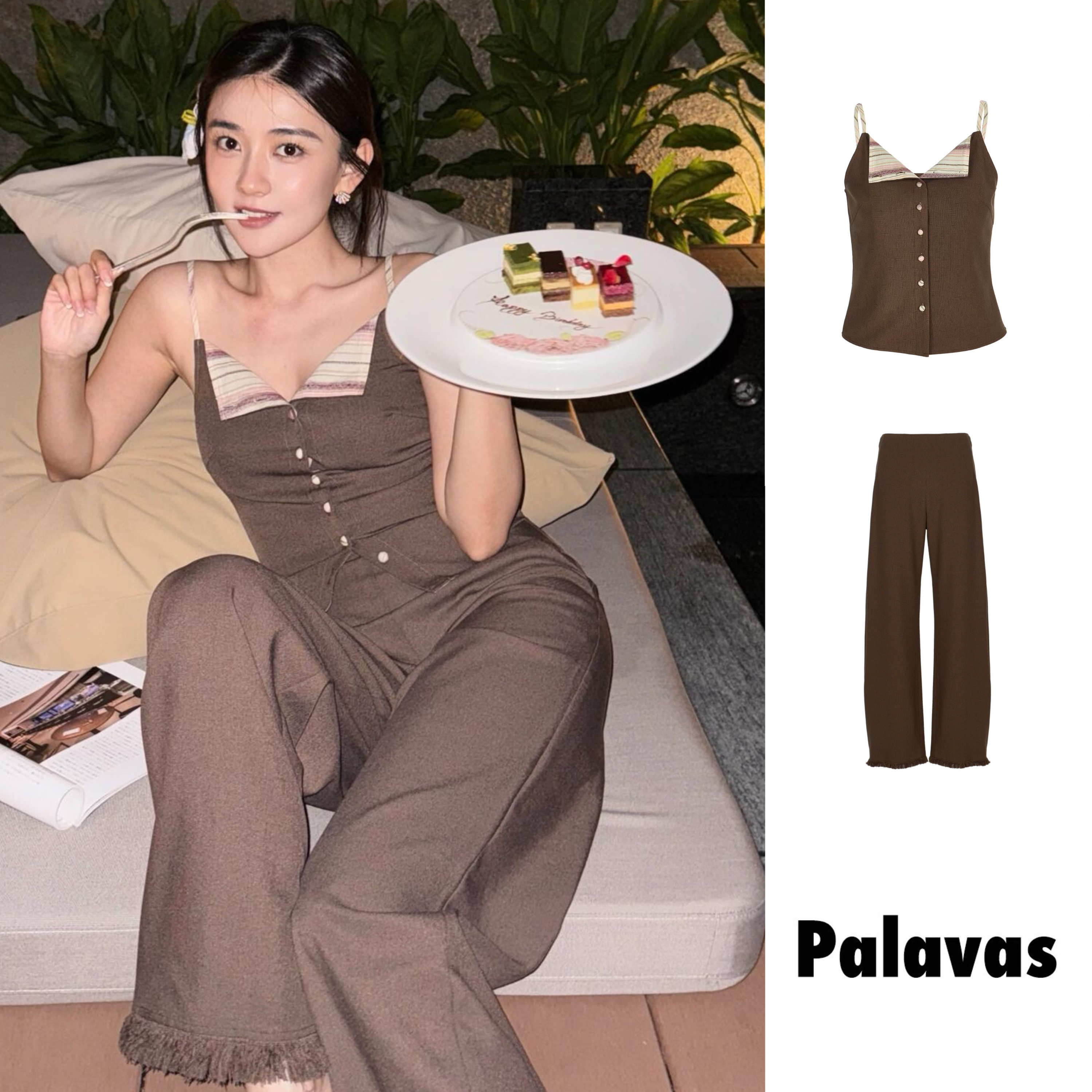 palavas任敏王紫璇孙乐言同款吊带翻领上衣砂岩流苏长裤时尚套装