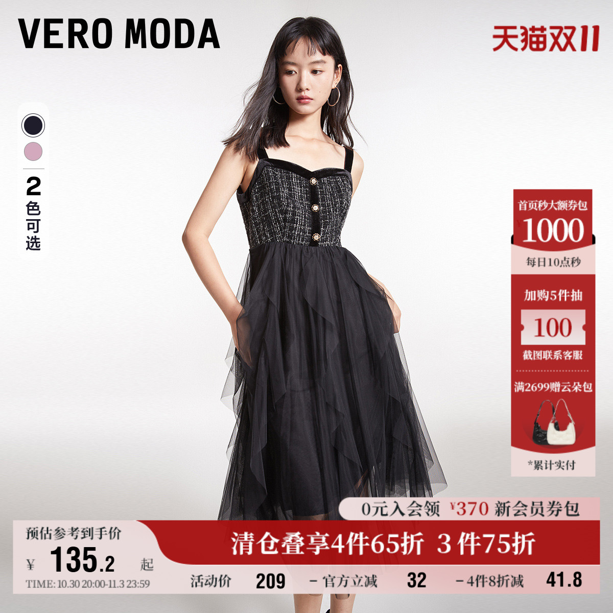 Vero Moda奥莱连衣裙子秋冬清仓优雅气质通勤拼纱小香风吊带裙女