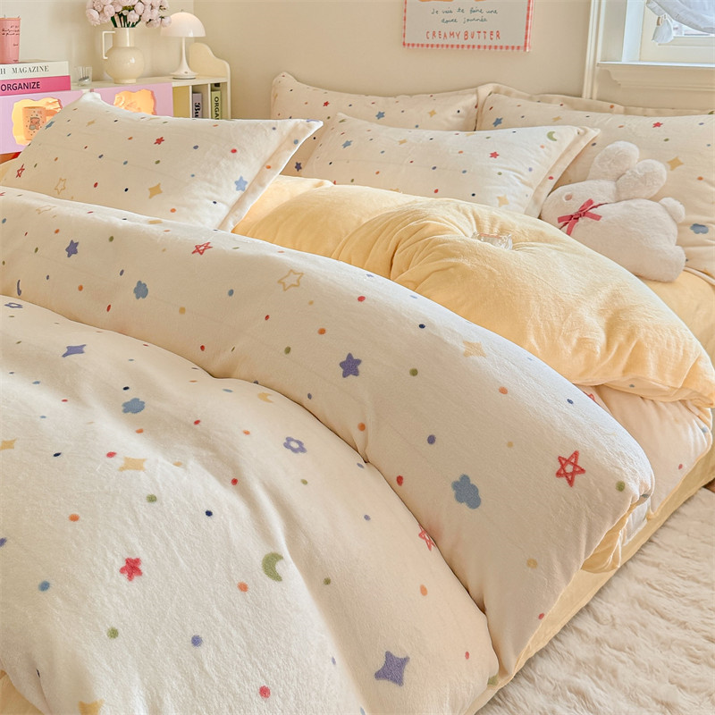 可爱卡通柠檬牛奶绒四件套冬季加厚双面毛绒珊瑚绒被套少女心床品