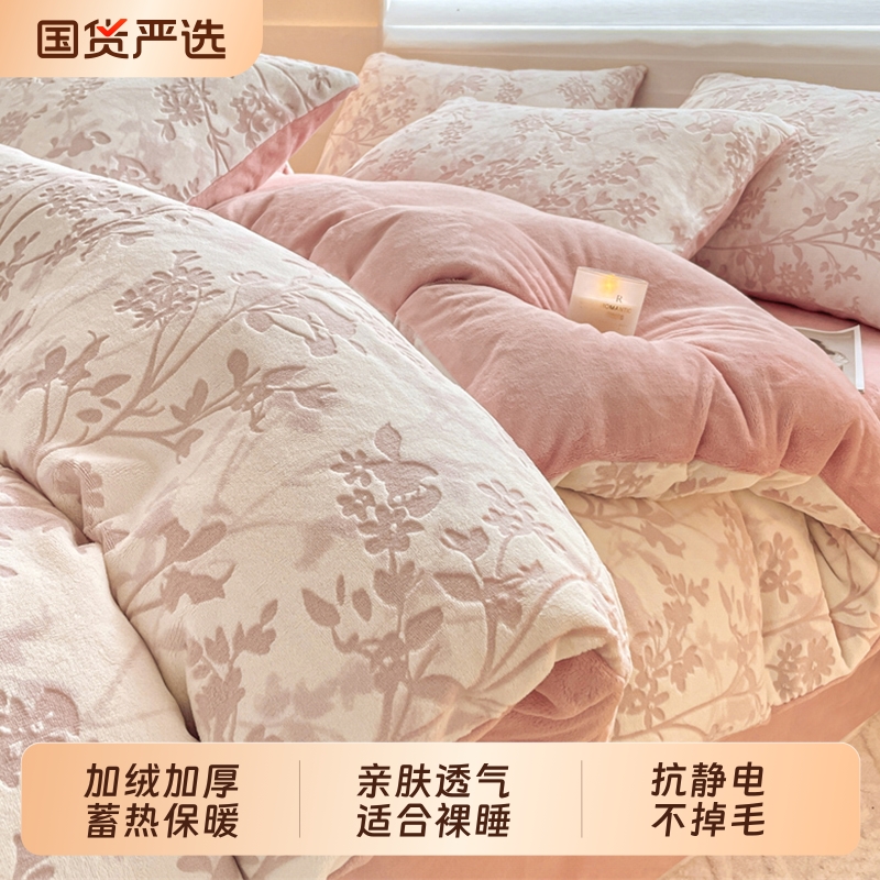 都市丽人雕花牛奶绒四件套2025新款冬季加厚珊瑚绒被套床单法兰绒