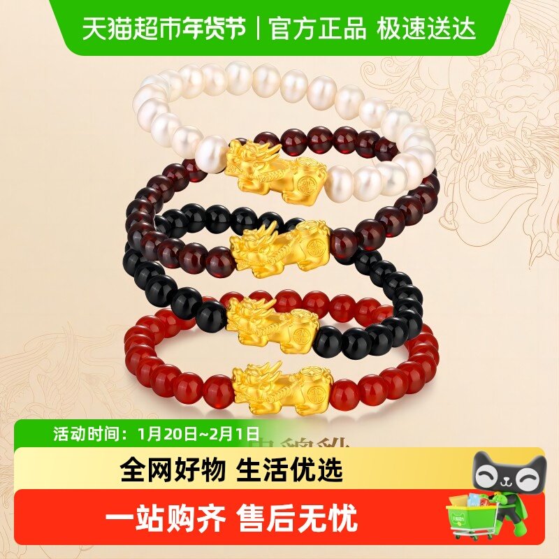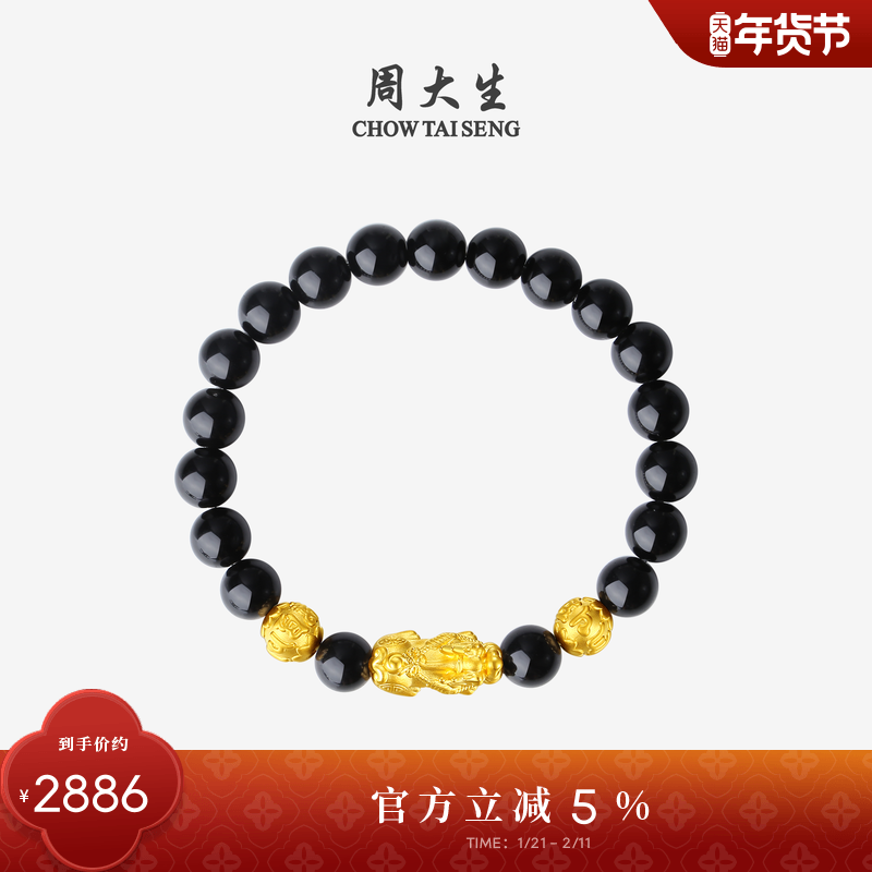 周大生黄金貔貅情侣手串男转运珠硬金黑曜石手链新年礼物送男女友