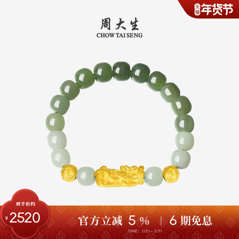 周大生黄金镶玉手串足金硬金和田玉情侣貔貅手链新年礼物送男朋友