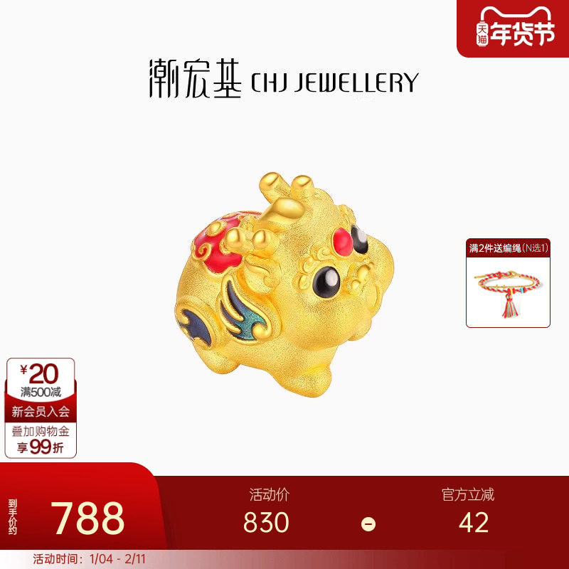 潮宏基足金串珠黄金金坨坨5D硬金鎏彩隔珠貔貅马年盘缠金DIY礼物