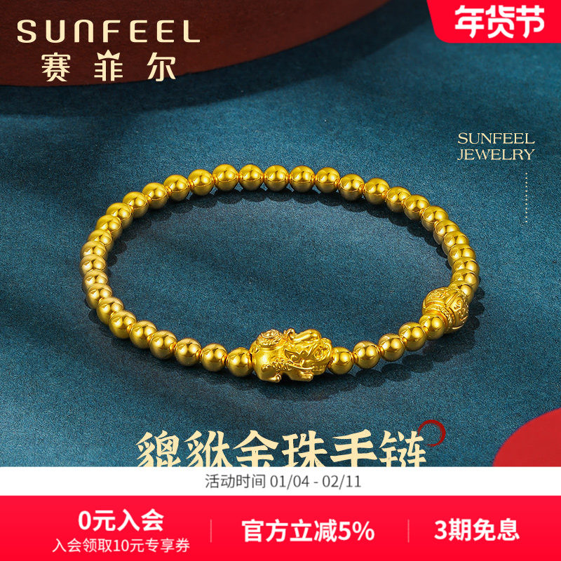赛菲尔黄金手链5D硬金貔貅手链经典金珠手串国风足金转运珠送女友