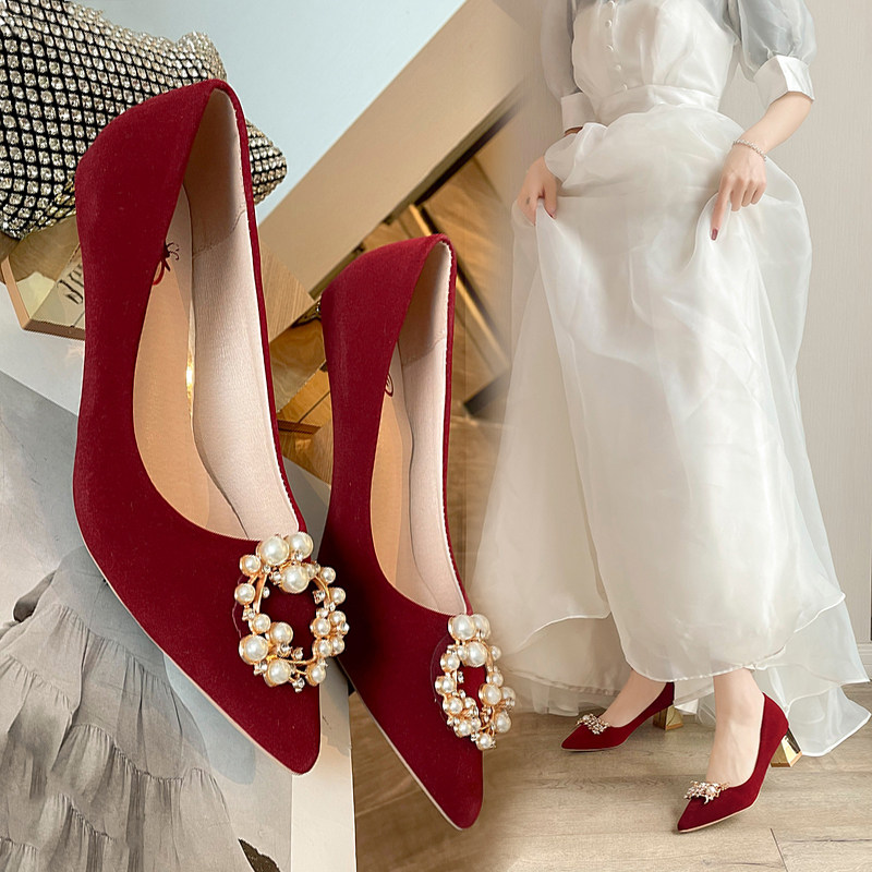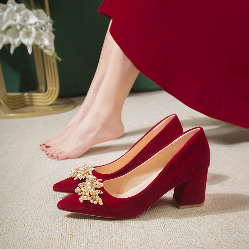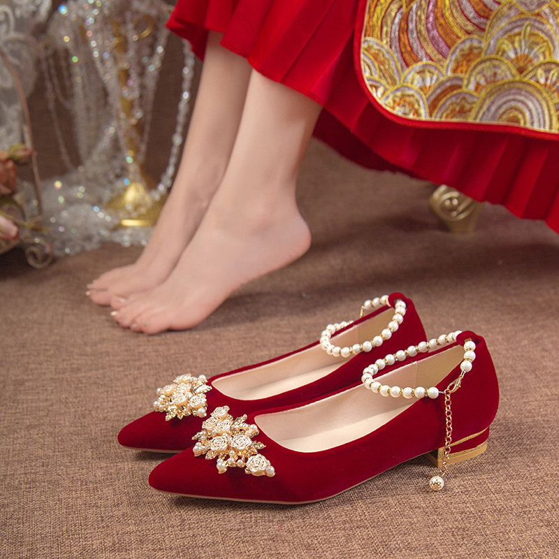 红色婚鞋新娘鞋中式秀禾服尖头不累脚水钻绒面孕妇可穿低跟敬酒鞋