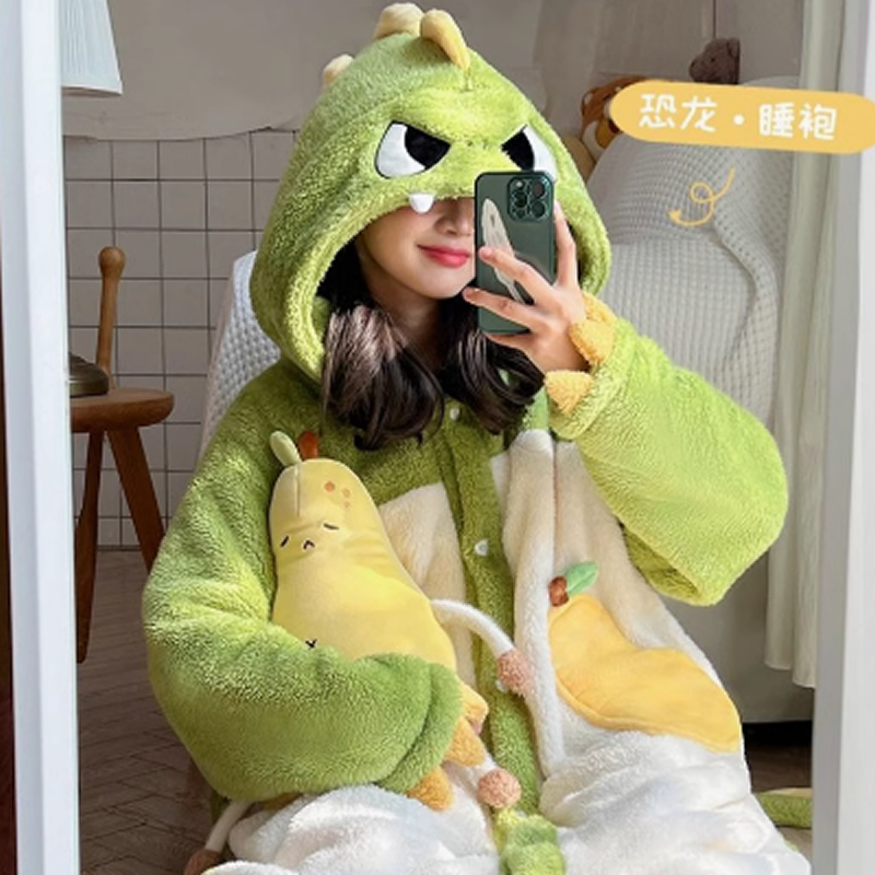 秋冬季珊瑚绒恐龙睡袍男女情侣浴袍搞怪成人可爱法兰绒家居服睡衣