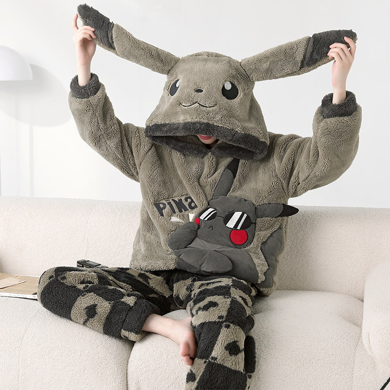 男士睡衣秋冬款冬季珊瑚绒加厚加绒卡通皮卡丘连帽家居服学生套装
