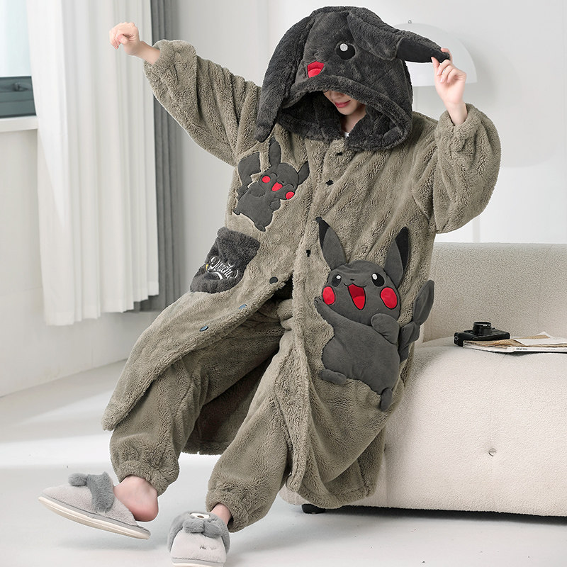 皮卡丘睡衣女冬三层加厚加绒珊瑚绒中长款夹棉袄法兰绒家居服套装