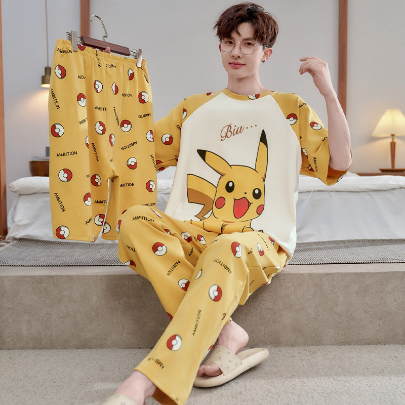 皮卡丘睡衣男春夏季纯棉短袖长裤薄款三件套青少年男孩大码家居服
