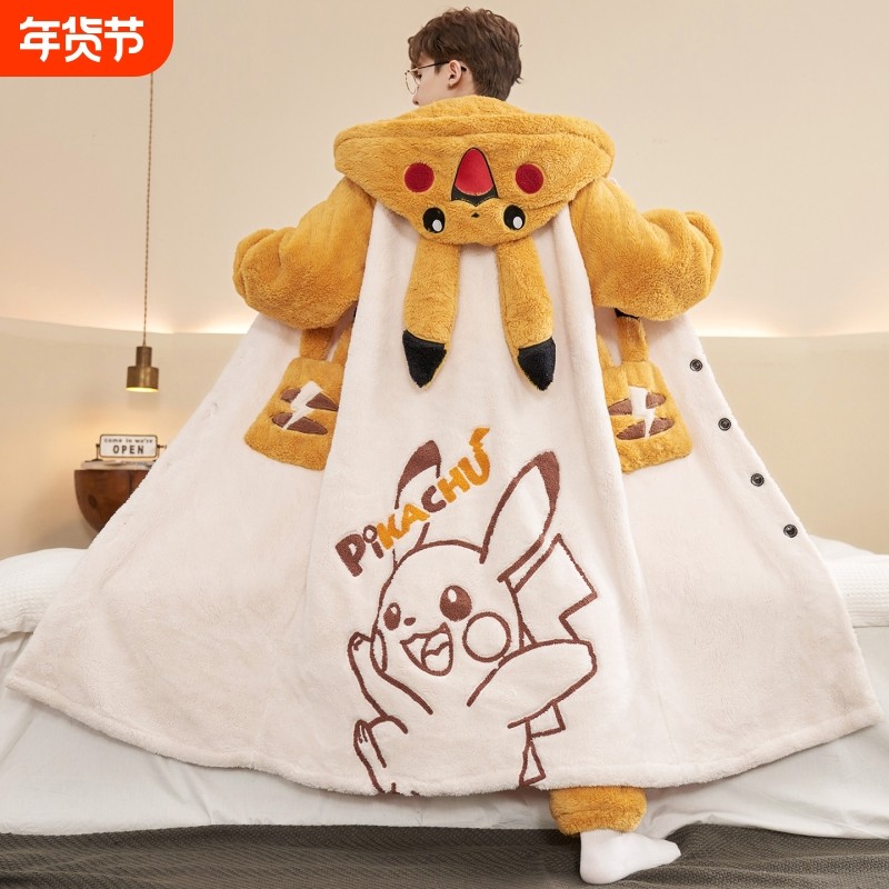 男士睡衣秋冬款冬季珊瑚绒加厚加绒卡通皮卡丘保暖睡袍家居服套装