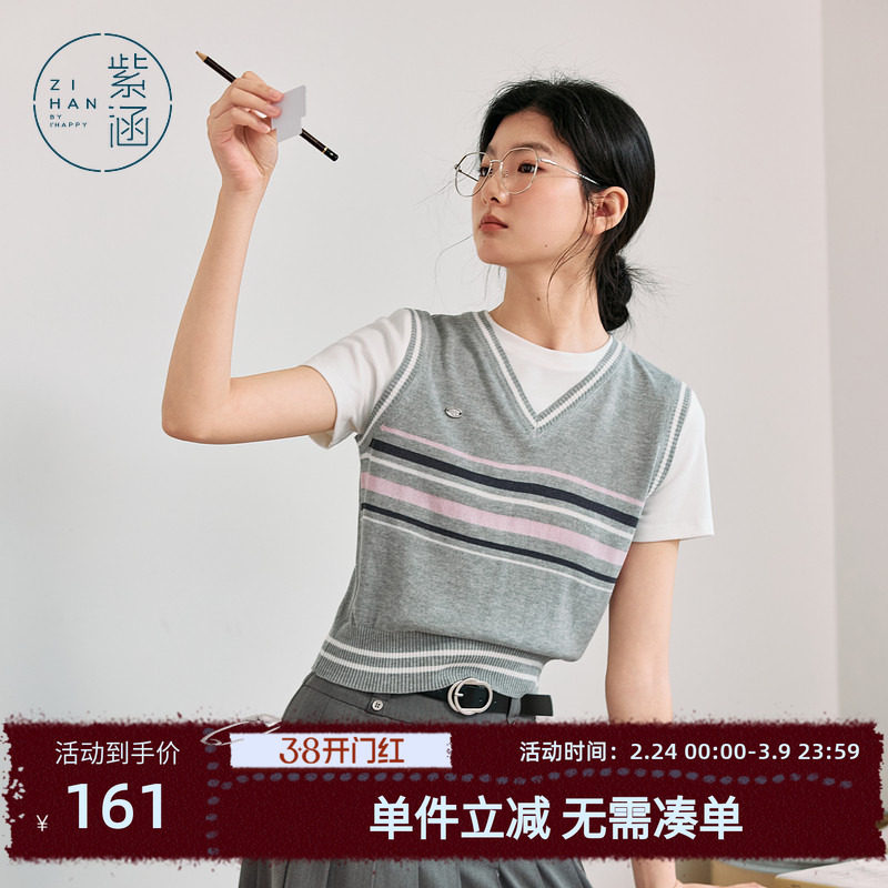 紫涵假两件灰色条纹短袖针织衫女夏季新款学院风撞色拼接圆领T恤