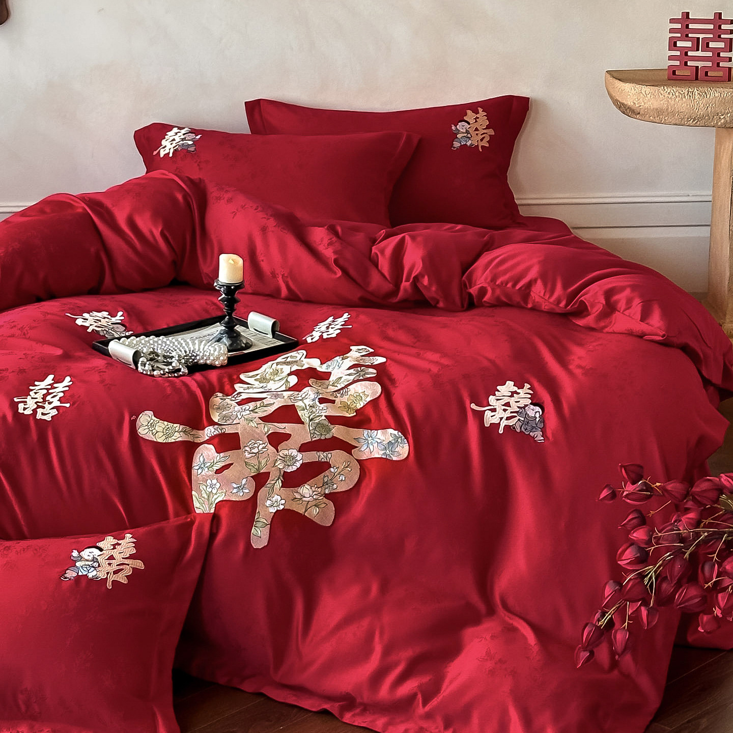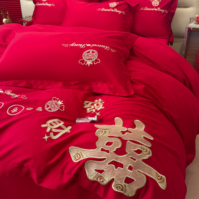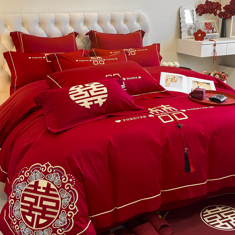 新中式160支长绒棉结婚四件套红色全棉被套婚庆纯棉婚房床上用品4