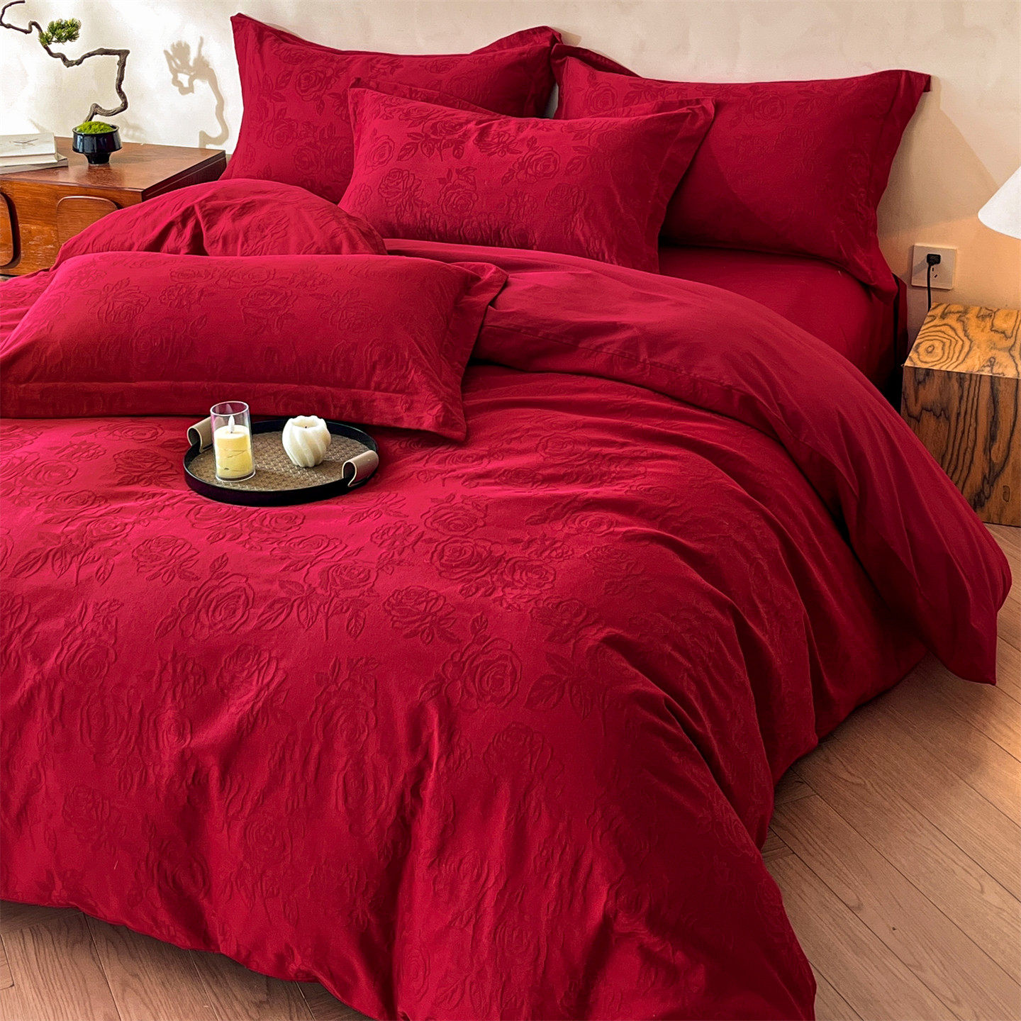 高级感纯棉提花婚庆四件套红色结婚全棉被套床单新婚喜被床上用品