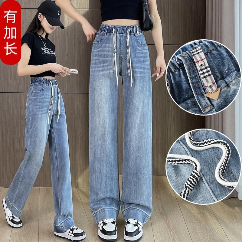 加长牛仔裤子女窄版2025春秋新款初中高中学生松紧腰直筒阔腿长裤
