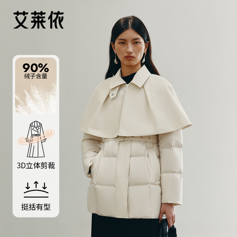 艾莱依2025新款鹅绒服女可脱卸斗篷大气干练时尚腰带显瘦短款外套