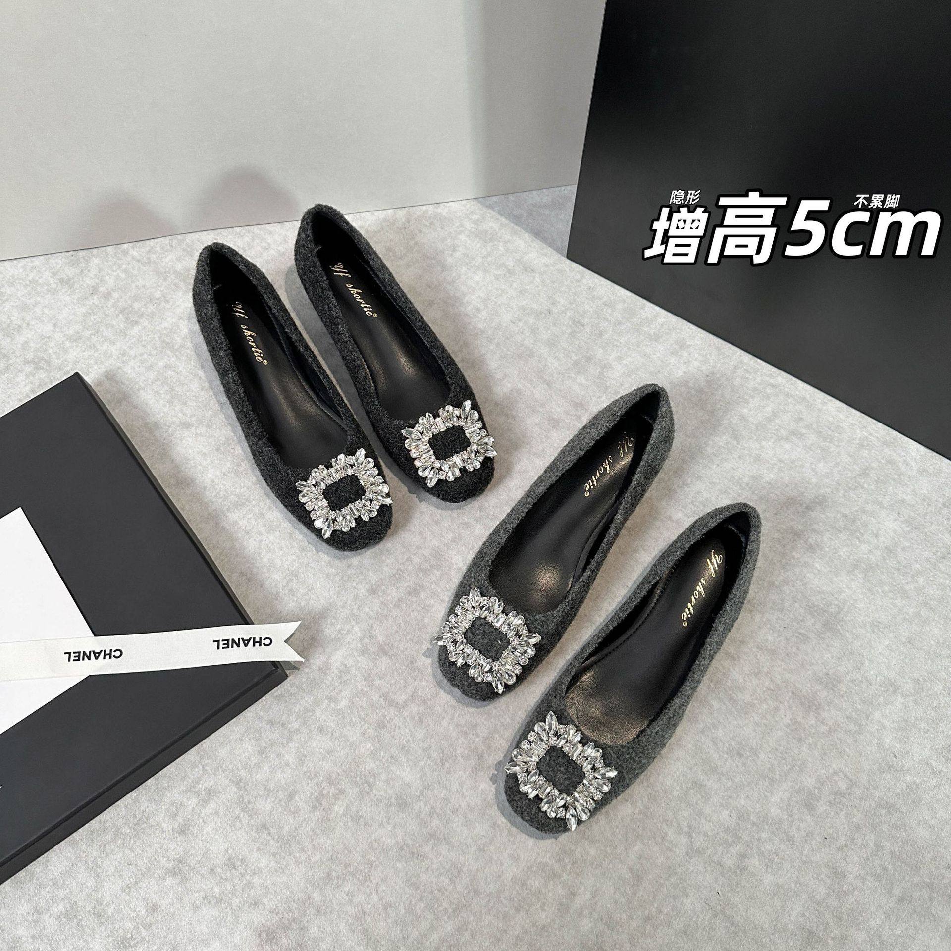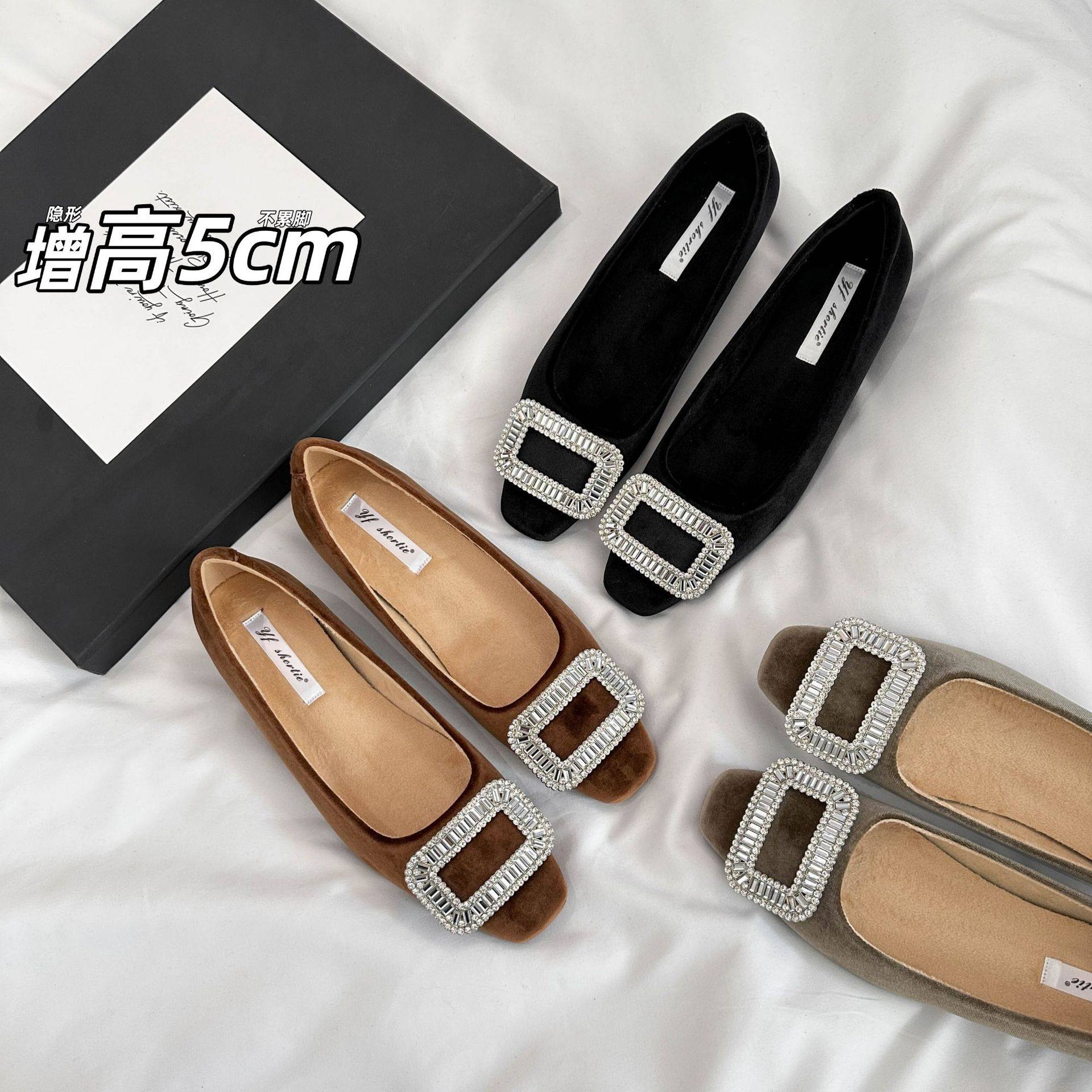 5公分水钻方扣绒面浅口单鞋女2025新款通勤不累脚方头平底鞋
