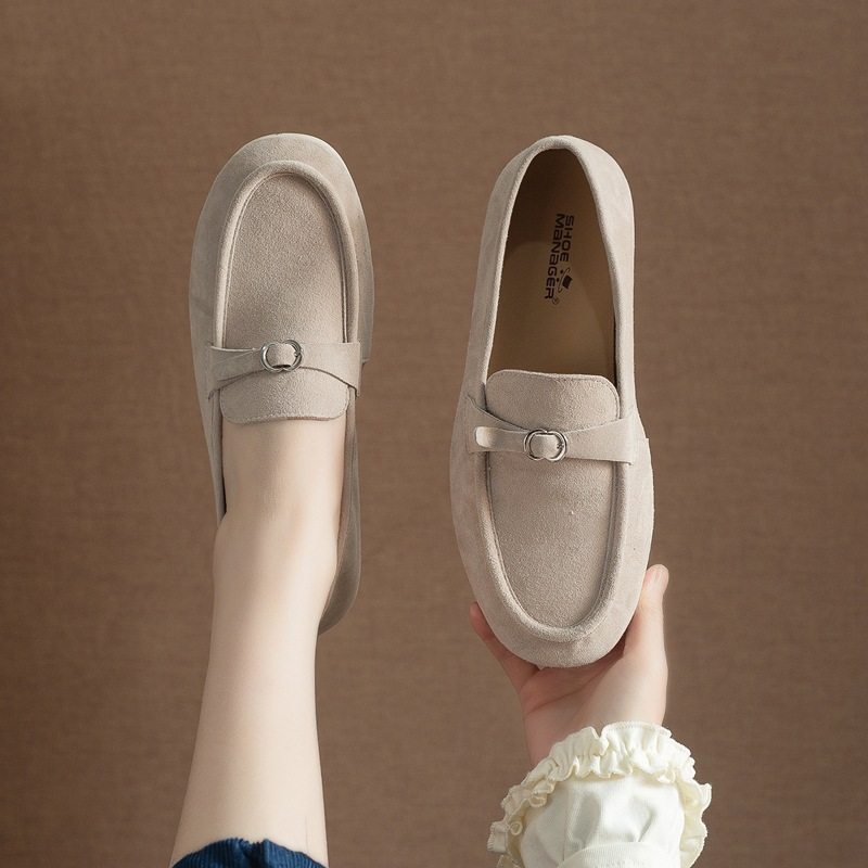 千百度平底低跟绒面乐福鞋豆豆鞋女百搭气质新款真皮通勤深口单鞋