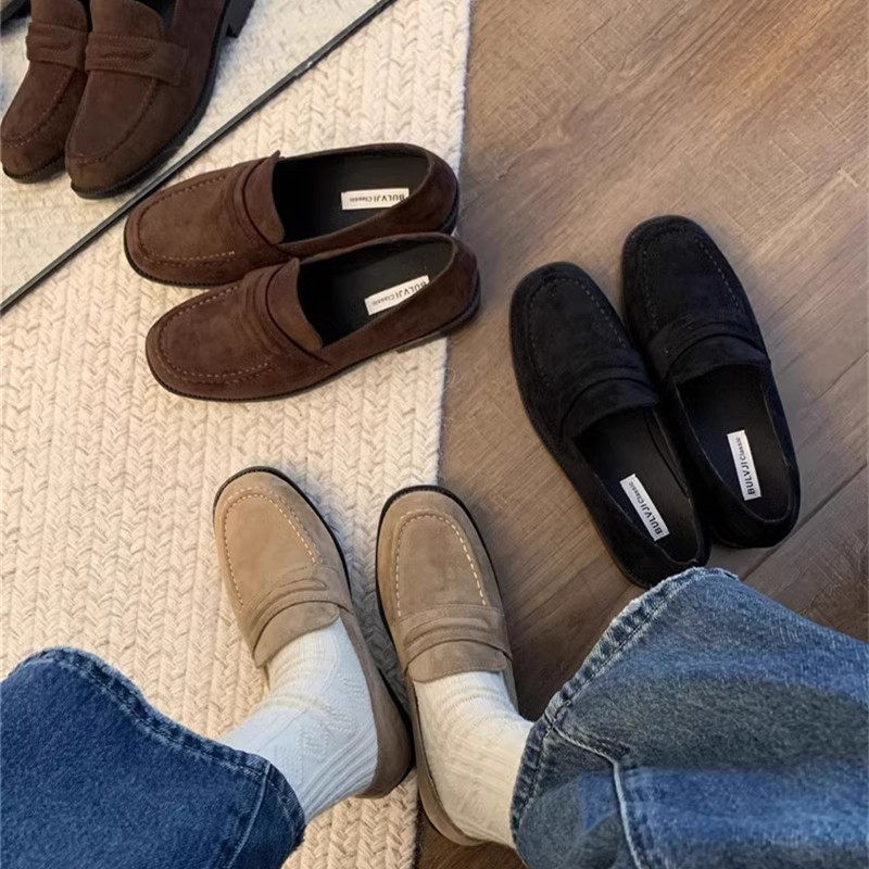美拉德复古绒面乐福鞋子女春秋新款法式休闲平底单鞋一脚蹬小皮鞋