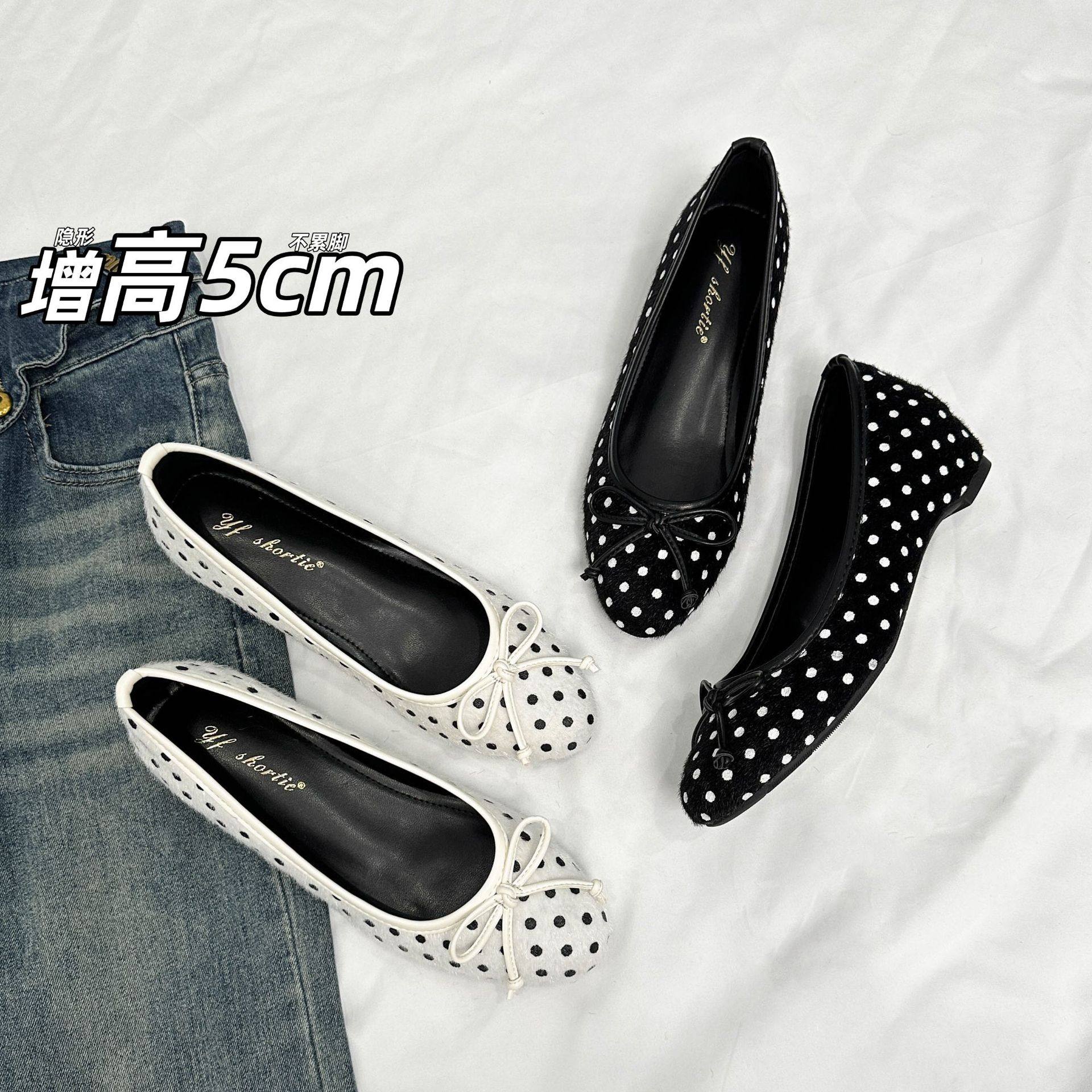 5cm蝴蝶结波点平底单鞋女2025新款小香风一脚蹬绒面玛丽珍鞋