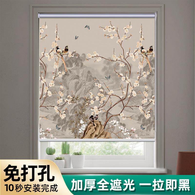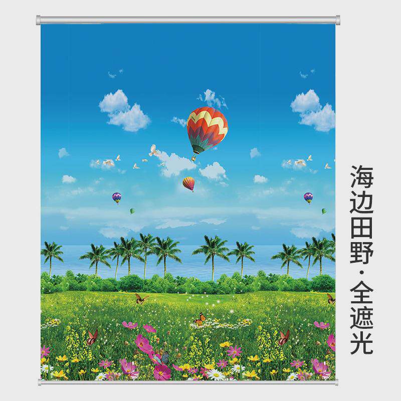 手拉式卷帘窗帘百叶遮光卧室厨房厕所卫生间免打孔升降遮阳帘风景