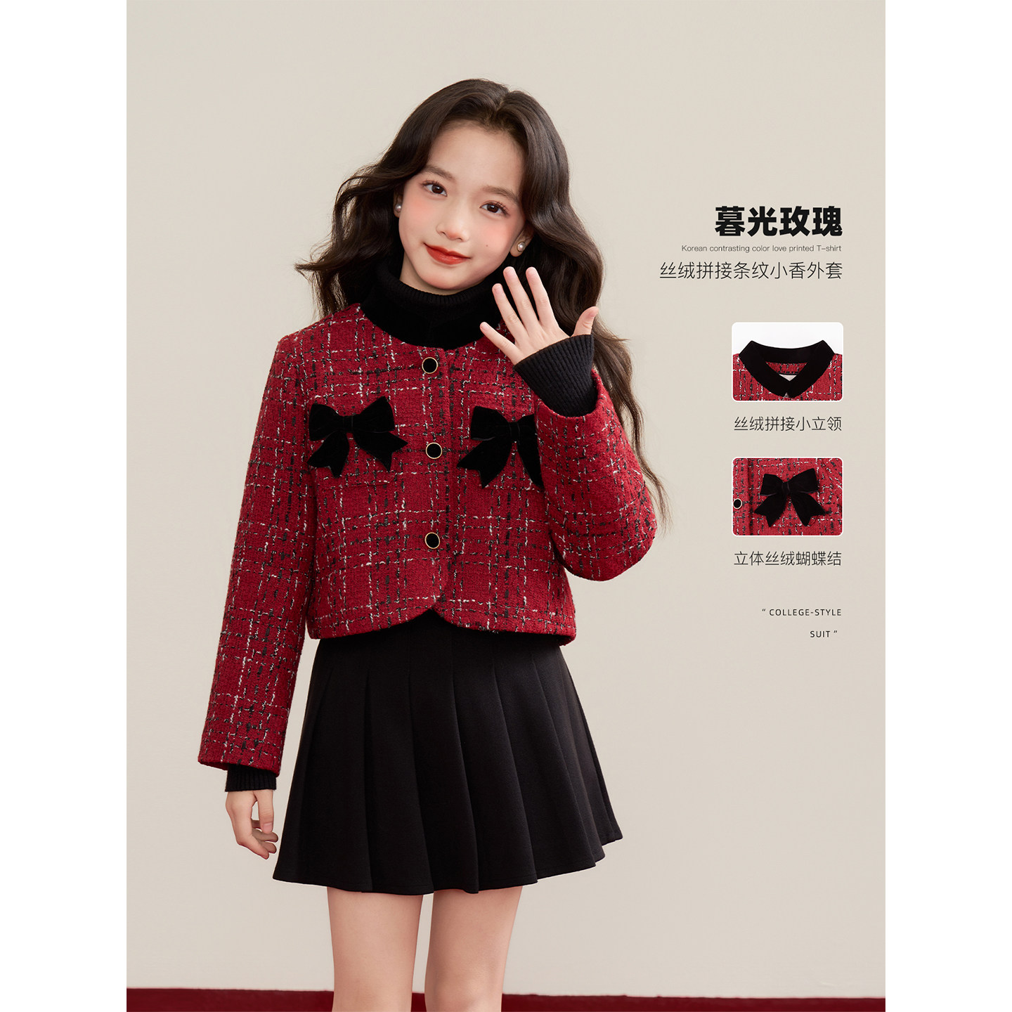 Amybaby女童上衣冬季2025新款蝴蝶结气质名媛小香风丝绒拼接外套