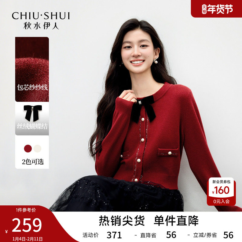 秋水伊人丝绒蝴蝶结红色针织上衣女2026年春季新款内搭开衫打底衫