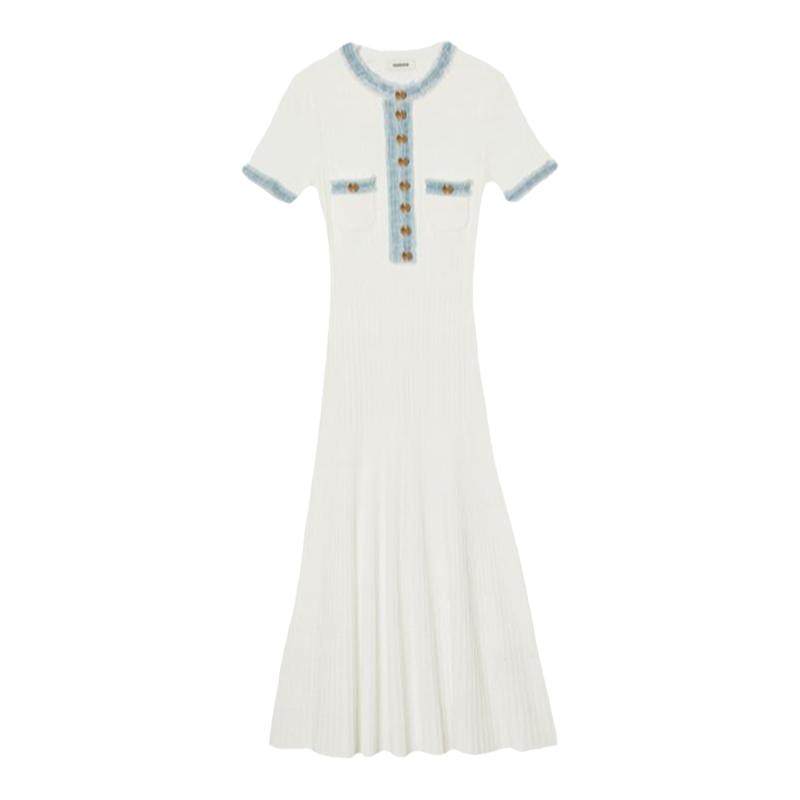SANDRO Outlets春夏女装法式简约气质白色撞色镂空长款针织连衣裙