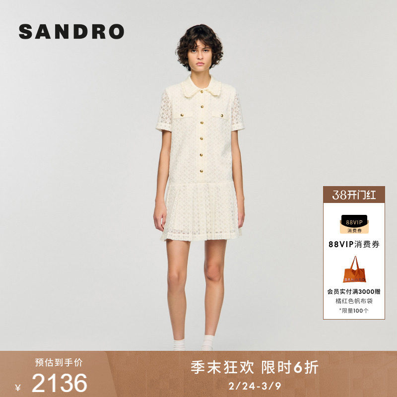 季末6折SANDRO2025秋冬新款女装甜美白色小花边娃娃领百褶连衣裙