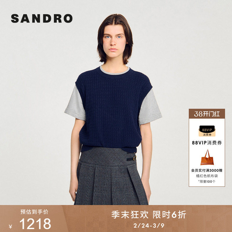 季末6折SANDRO2025秋冬新款女装法式棉羊毛混纺假两件绞花针织衫