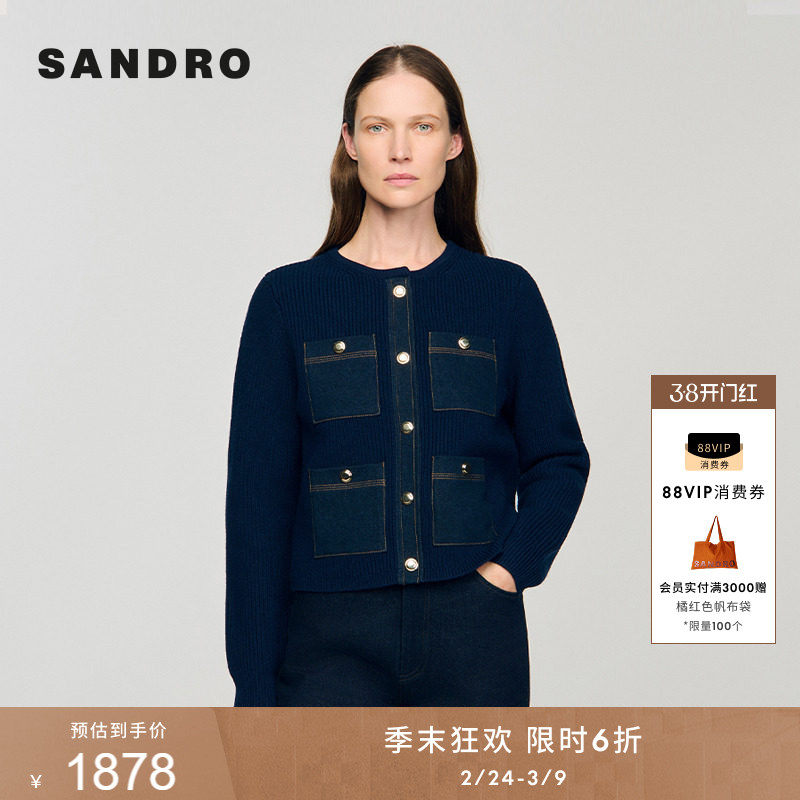 季末6折SANDRO2025秋冬新款女装绵羊毛蓝色拼贴牛仔口袋针织开衫