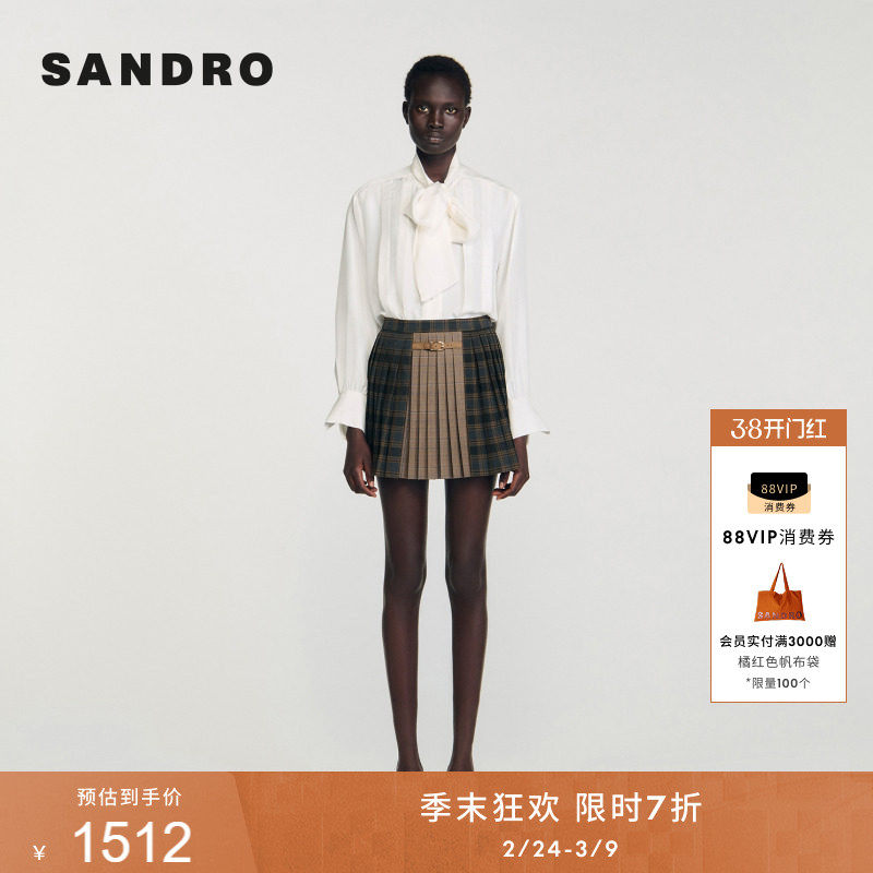 季末7折SANDRO2025秋冬新款女装法式学院风格纹皮扣百褶半身裙