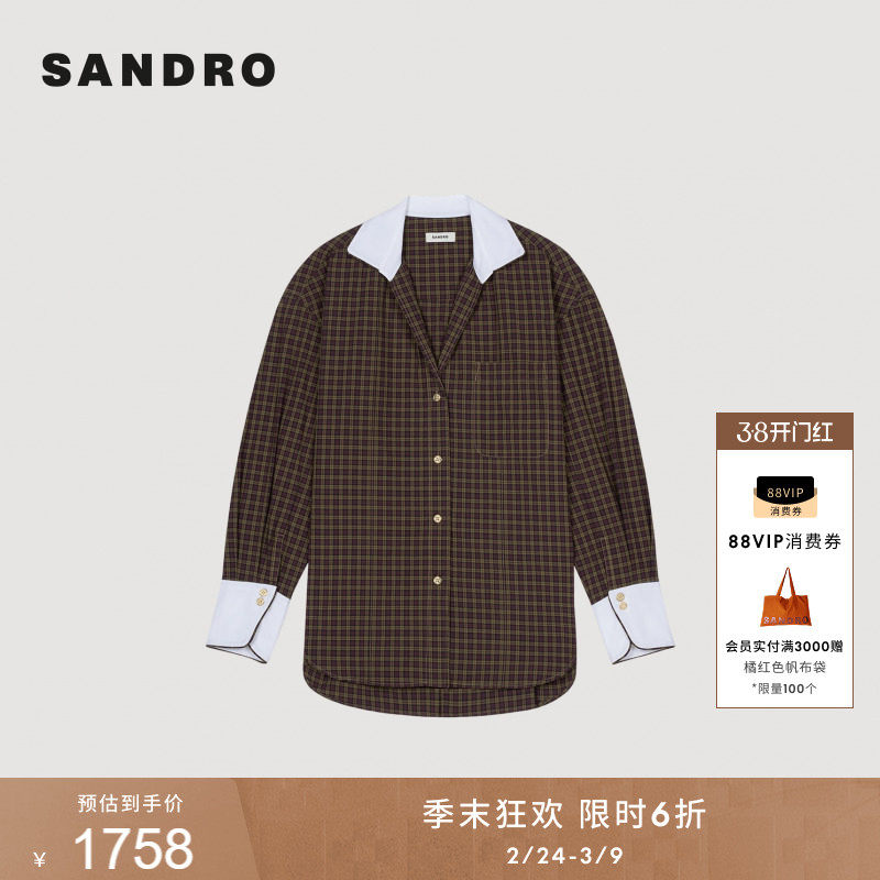 季末6折SANDRO2025秋冬新款女装棉质撞色拼接落肩袖细格纹衬衫
