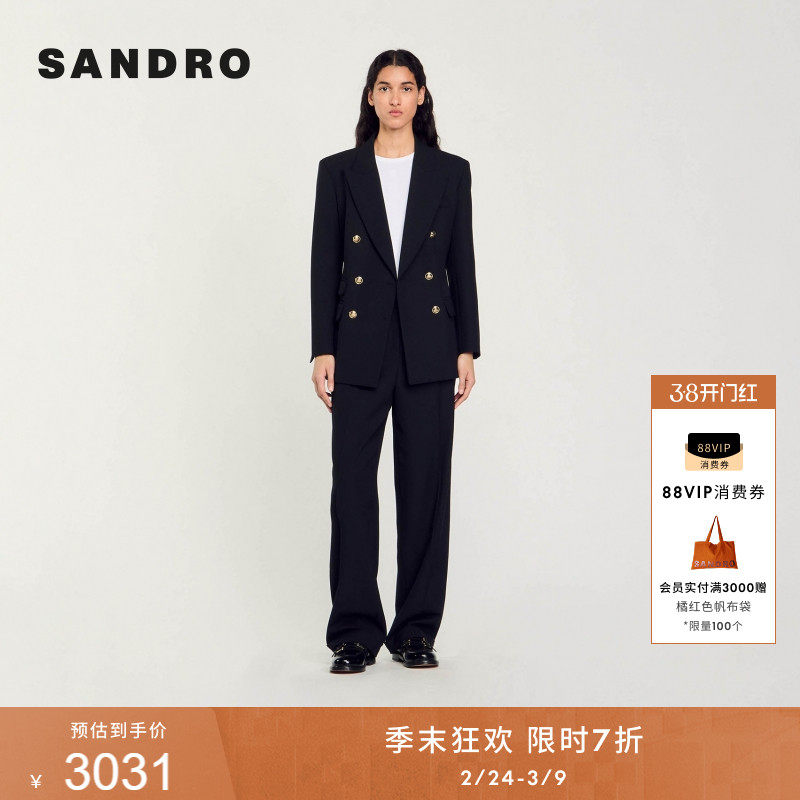 季末7折SANDRO秋冬女装法式通勤高知风黑色双排扣平驳领西装外套
