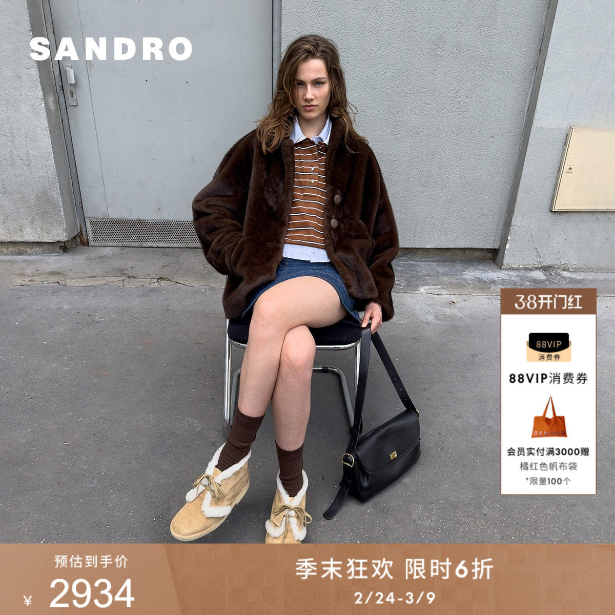 季末6折SANDRO2025秋冬新款女装优雅简约平驳领毛绒人造皮草外套