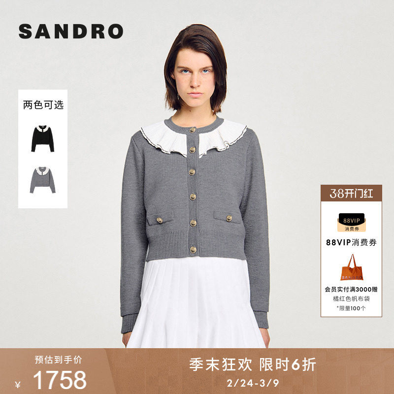 线上限定SANDRO秋冬女装法式气质格雷系灰色撞色花边翻领针织开衫