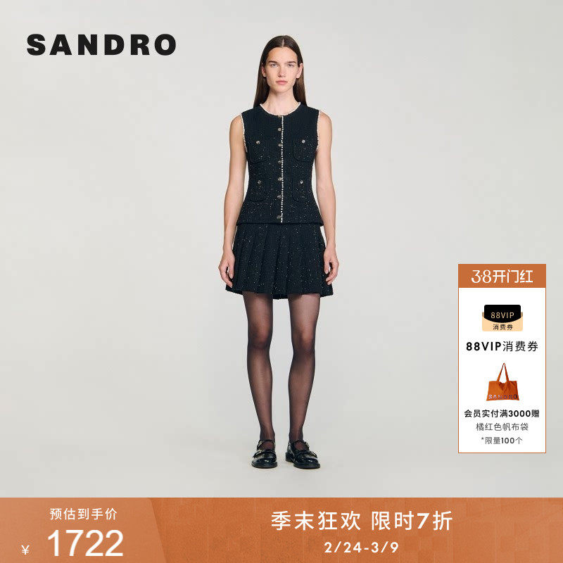 季末7折SANDRO2025秋冬新款女装黑色仿珠饰门襟亮片无袖针织马甲