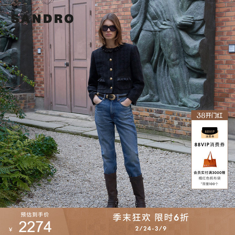 季末7折SANDRO2025秋冬新款女装法式可拆卸金色纽扣撞色花呢外套