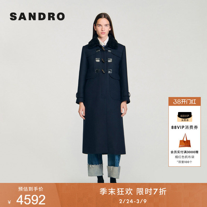 季末7折SANDRO2025秋冬新款女装可拆卸毛领复古牛角扣A字毛呢大衣