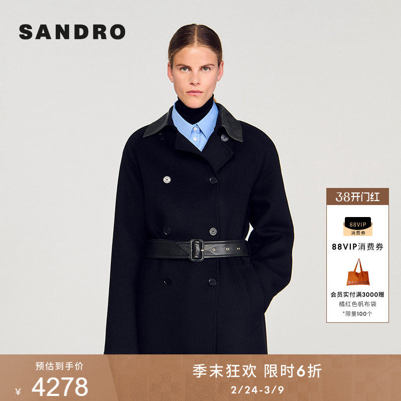 季末6折SANDRO2025秋冬新款女装法式黑色双排扣羊毛混纺毛呢大衣