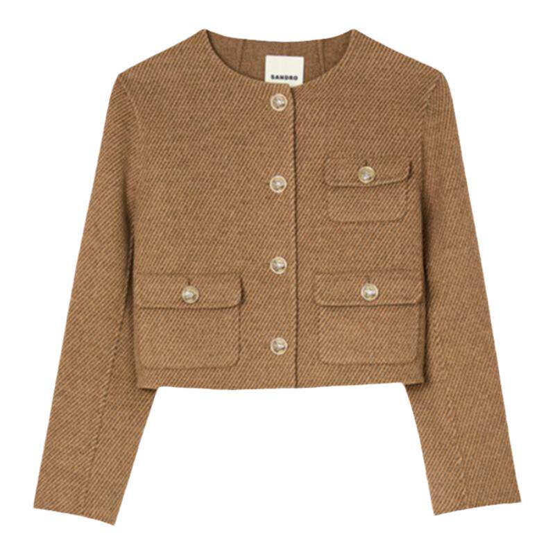 SANDRO秋冬女装迪木尔风法式气质羊毛混纺棕黄色斜纹短款长袖外套