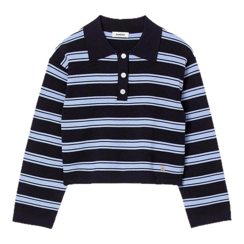 季末7折SANDRO2025秋冬新款女装法式学院风条纹翻领POLO针织衫